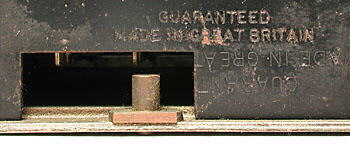 This cut-out and lug, underneath at the rear, are an unusual feature. It is obvious that the cut-out has been stamped from a standard bottom sheet and has cut through the original "Guaranteed made in Great Britain" which has had to be stamped again.