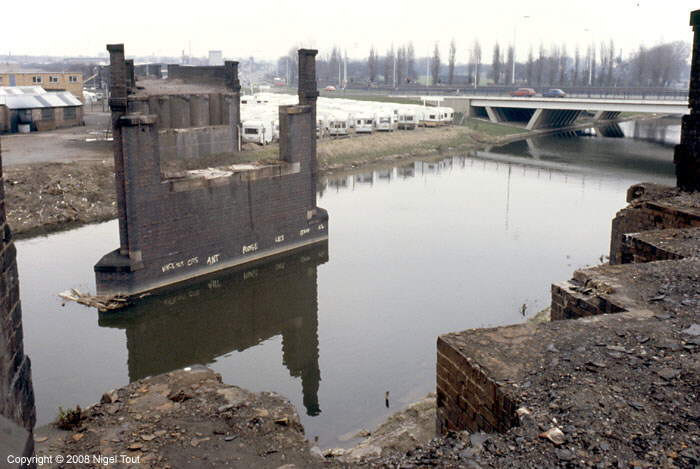 The site of the double span bridge across the River Soar, looking south west from Saint Margaret’s Way, with the centre support still in position in the middle of the river. The scene looked similar to this for over 20 years.