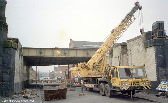 Demolition of the bridge over Soar Lane is well advanced, looking west.