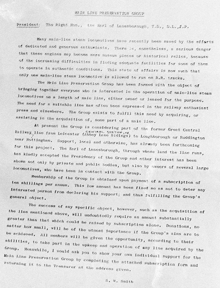 main-line steam locomotives on a length of main line, either owned or leased for the purpose. The need for a suitable line has often been expressed in the railway enthusiast press and elsewhere. The Group exists to fulfil this