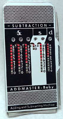 stylus operated "Addiator"-type decimal calculator, 6 decades, addition on front, subtraction on back.