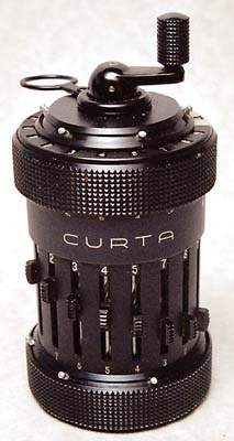 Curta I, miniature stepped gear calculator, 1948-early 1970s. Featured calculator.