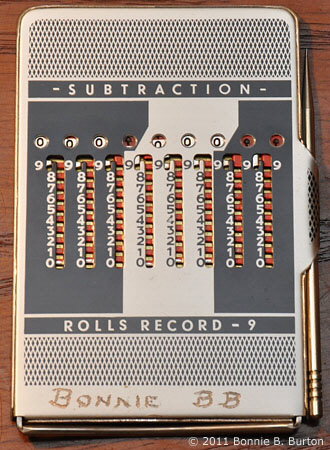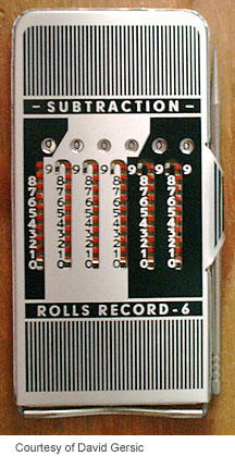 stylus operated "Addiator"-type decimal calculator, 9 decades, addition on front, subtraction on back.