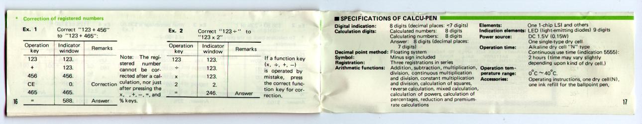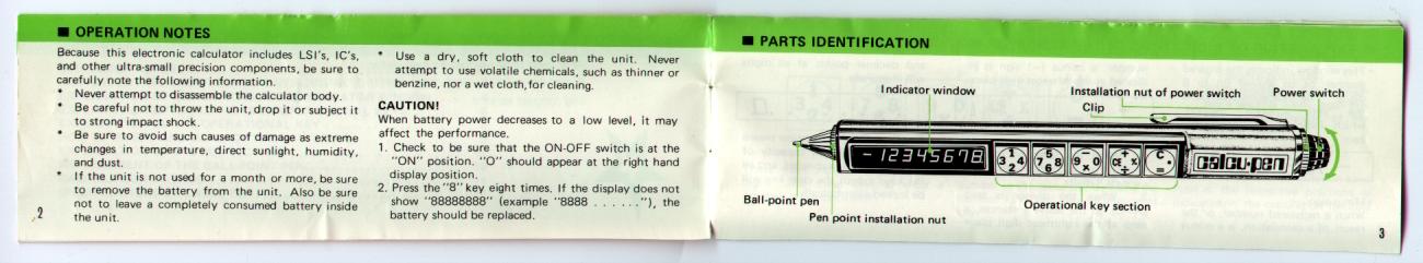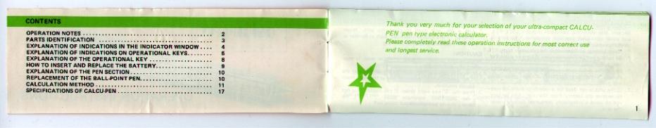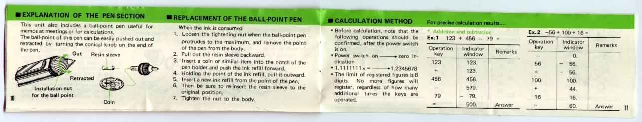 The illustrations below show the manual for the Calcu-pen. The scans were supplied by Don DiGalbo. Thanks Don!